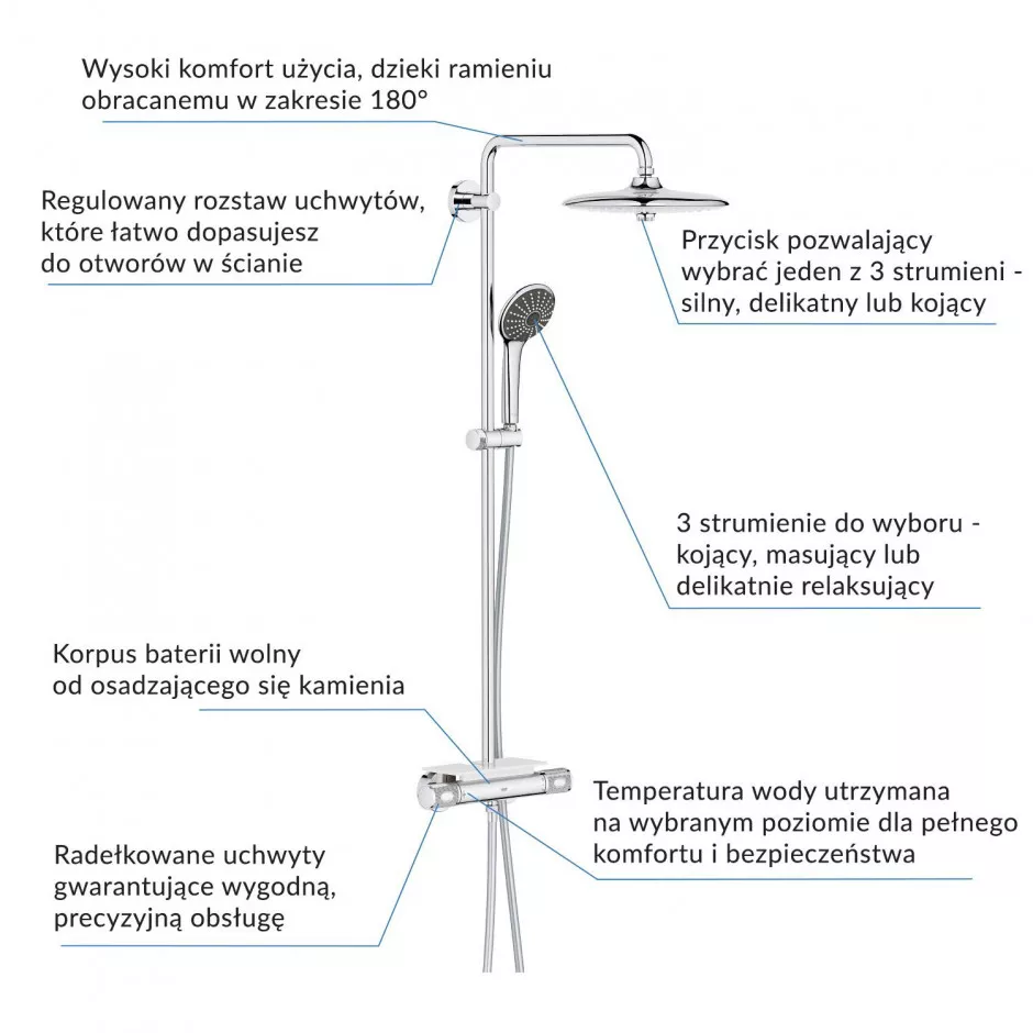 Z systemem prysznicowym GROHE Vitalio 260 sprawisz, że codzienna kąpiel będzie zawsze przyjemnym, odprężającym doświadczeniem. Dzięki deszczownicy i słuchawce, które oferują po 3 strumienie wody do wyboru, zyskasz ogromne możliwości personalizacji kąpieli, a zastosowana w nich technologia GROHE DreamSpray gwarantuje, że przepływ pozostanie zawsze cudownie pełny i równy. Dysze obydwu natrysków, dla większej trwałości zostały wykonane z silikonu - wystarczy przetrzeć je ręką, żeby usunąć osadzający się w nich kamień i przywrócić im idealną drożność. Przekłada się to bezpośrednio na ich długoletnią trwałość, znakomicie współgrającą z wytrzymałością powierzchni systemu GROHE Vitalio 260, która została pokryta lśniącą, odporną na uszkodzenia powłoką GROHE StarLight. Aby dodatkowo zwiększyć wygodę użycia i zagwarantować Ci pełne bezpieczeństwo, bateria została wyposażona w termostatyczną głowicę GROHE TurboStat, która utrzymuje temperaturę wody na wybranym przez użytkownika poziomie przez cały czas trwania kąpieli. Dodatkowym atutem jest blokada SafeStop, która uniemożliwia przypadkowe włączenie zbyt gorącego przepływu, co jest szczególnie istotne dla osób opiekujących się małymi dziećmi. Zadbaj o komfort w swojej łazience i zaufaj sprawdzonym rozwiązaniom GROHE wybierając system prysznicowy GROHE Vitalio 260!