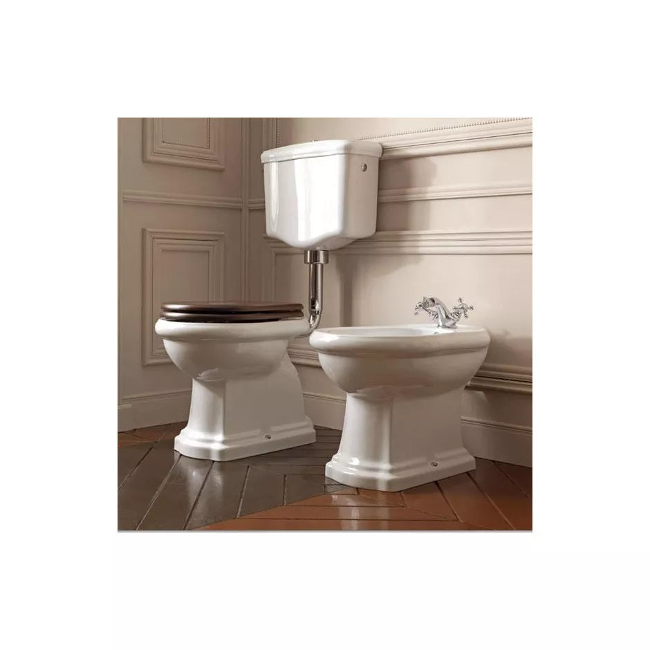 Miska WC Kerasan Retro (numer katalogowy 101001) to klasyczna, stojąca miska WC z odpływem pionowym "S", zaprojektowana w stylu retro. Miska ma wymiary 59 x 38,5 x 42 cm i waży 22 kg. Produkt wykonany jest z wysokiej jakości ceramiki w eleganckim białym kolorze, co czyni go idealnym wyborem do łazienek w klasycznym stylu. Miska jest kompatybilna z różnymi zbiornikami WC i wymaga osobnego zakupu deski sedesowej. Dzięki starannemu wykonaniu i solidnemu materiałowi, produkt Kerasan Retro zapewnia długotrwałe i bezproblemowe użytkowanie. Możliwość wyboru wykończenia w trzech kolorach: złotym, chromowanym i brązowym, pozwala na dopasowanie do indywidualnych potrzeb.