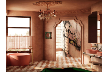 Ta inspiracja ukazuje nowoczesną łazienkę, w której minimalizm spotyka się z elegancją i funkcjonalnością. Centralnym punktem wnętrza jest czarna, wolnostojąca wanna Kaldewei Oyo Duo o miękkiej, opływowej formie, nadająca przestrzeni luksusowego charakteru. Obok niej uwagę przyciągają umywalki nablatowe Kaldewei Miena o delikatnej linii, doskonale komponujące się z drewnianą szafką i błękitnym tłem ściany. Design dopełnia ścienna bateria umywalkowa Dornbracht Meta w wykończeniu czarnego matu, podkreślająca nowoczesny charakter aranżacji. Na podłodze zastosowano płytki Marazzi Grande Concrete Look White, które wizualnie powiększają przestrzeń i wprowadzają subtelną, industrialną nutę. Całość uzupełnia pokrywa odpływu liniowego Kaldewei Flowline Zero w kolorze czarnym, zapewniając spójność detali. Zieleń roślin przełamuje surowość wnętrza, tworząc harmonijną, elegancką przestrzeń idealną dla miłośników nowoczesnego stylu i ponadczasowego designu.